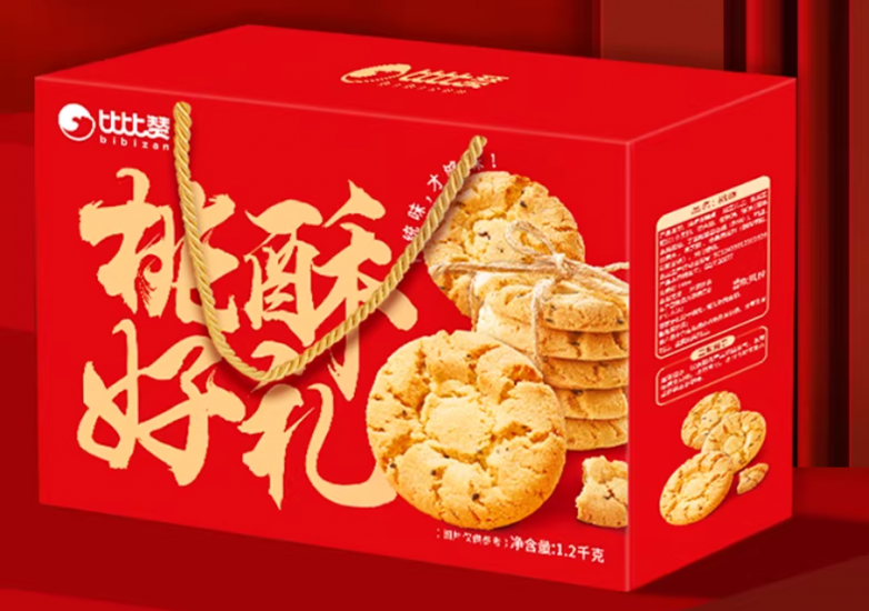 比比赞「桃酥礼盒」则回归传统酥点,其色泽金黄,圆润可爱,一口咬下,是记忆里那种纯粹的酥脆与浓郁的蛋香与油香,非常适合赠送给长辈。搭配一杯清茶,便是午后一段温暖闲适的时光。同样1.2kg的扎实分量,传递的是一份厚重而温暖的关怀。