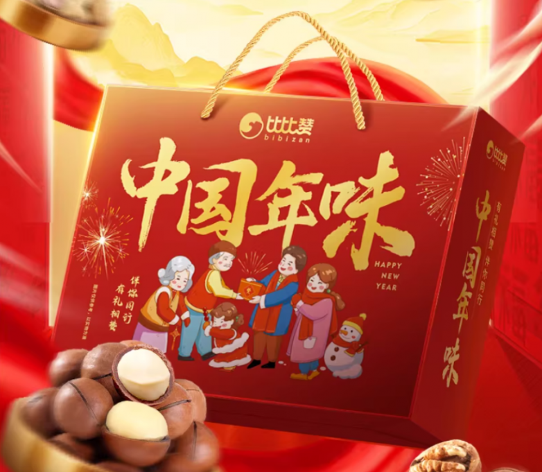 而比比赞「中国年味」礼盒则在丰盛之上,更添一份国潮美学与心意“豪横”。18包零食、16款不重样,不仅包含进口的奶香夏威夷果、经典怀旧的娃哈哈AD钙奶,还将花椒锅巴、蟹黄瓜子仁等零食炒货一并纳入。无论是馈赠亲友,还是作为企业福利,都能彰显诚意与品味,真正做到“礼”足“料”足,面子十足。